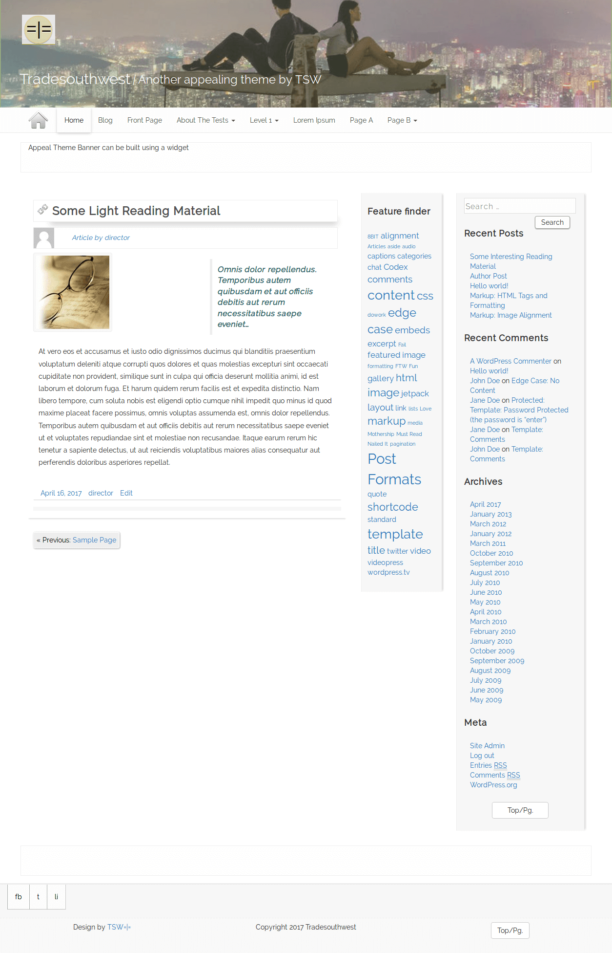 Appeal features a pull-quote block in the main content to display a short teaser. Pullquote uses the theme editor “excerpt” that is activated from “Screen Options” admin menu in upper right. Layouts show three columns on desktop sizes. For tablets, two columns at top with one at bottom. One column for mobile and small devices. Gravatar is screen-reader friendly and Author link, next to Gravatar in post title, uses its own menu to add author social and promotional links. Author page template and author modal. Theme has two blank banners that can be populated with widgets. Options: Set pullquote word-length and width; Set post excerpt length; Set Header color or image; Change background color of page, content area, footer and sidebars; Remove or show titles; Upload logo to top; Upload header image and change link colors; Demo is at https://larryjudd.us/appeal
